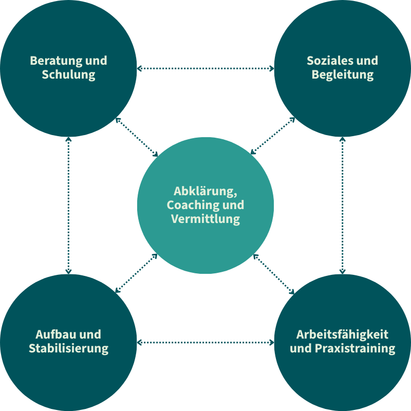 Die Kompetenzzentren arbeiten eng verzahnt und werden je nach Ausgangslage gezielt miteinander kombiniert. Abklärung, Coaching und Vermittlung wird einbezogen, wenn vorbereitete Entwicklungen in eine konkrete Ausbildungs- oder Beschäftigungslösung überführt werden sollen. Das Kompetenzzentrum knüpft an bestehende Unterstützung an und begleitet den Übergang verbindlich bis zur stabilen Verankerung im Arbeitskontext.
