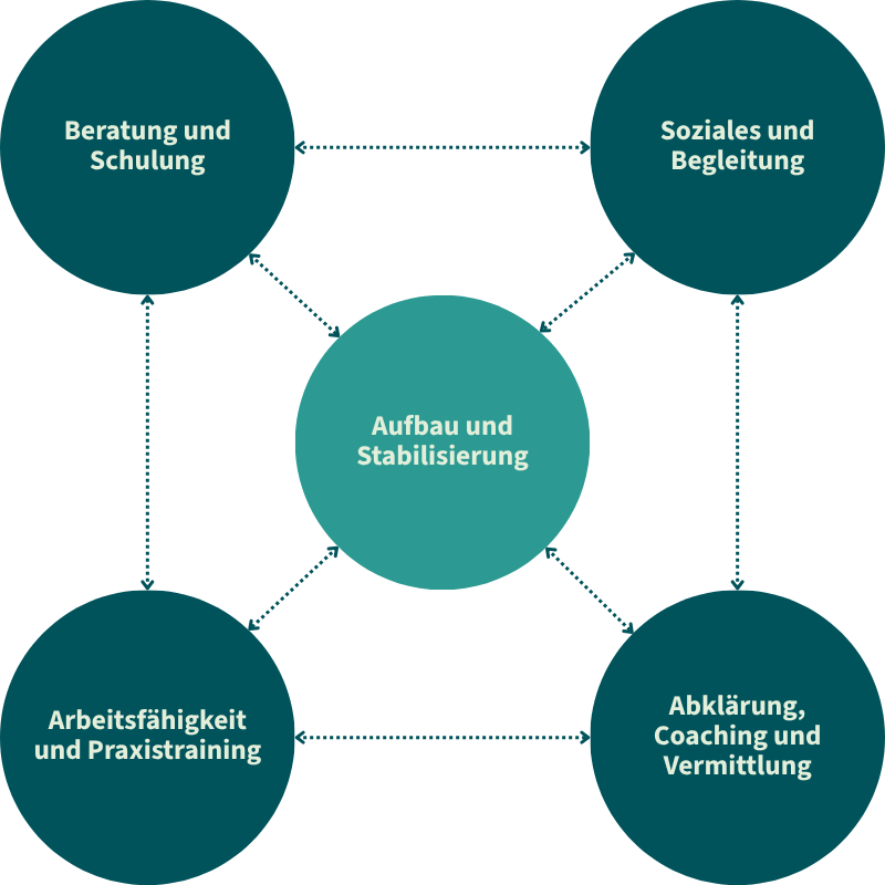 Die Kompetenzzentren arbeiten eng verzahnt und werden je nach Ausgangslage gezielt miteinander kombiniert. Aufbau und Stabilisierung wird einbezogen, wenn strukturierende Tagesangebote und ein schrittweiser Belastungsaufbau erforderlich sind, um Entwicklung zu ermöglichen. Das Kompetenzzentrum knüpft an bestehende Unterstützung an, vertieft diese durch gezielte Entwicklungsangebote und schafft die Grundlage für weiterführende Schritte.